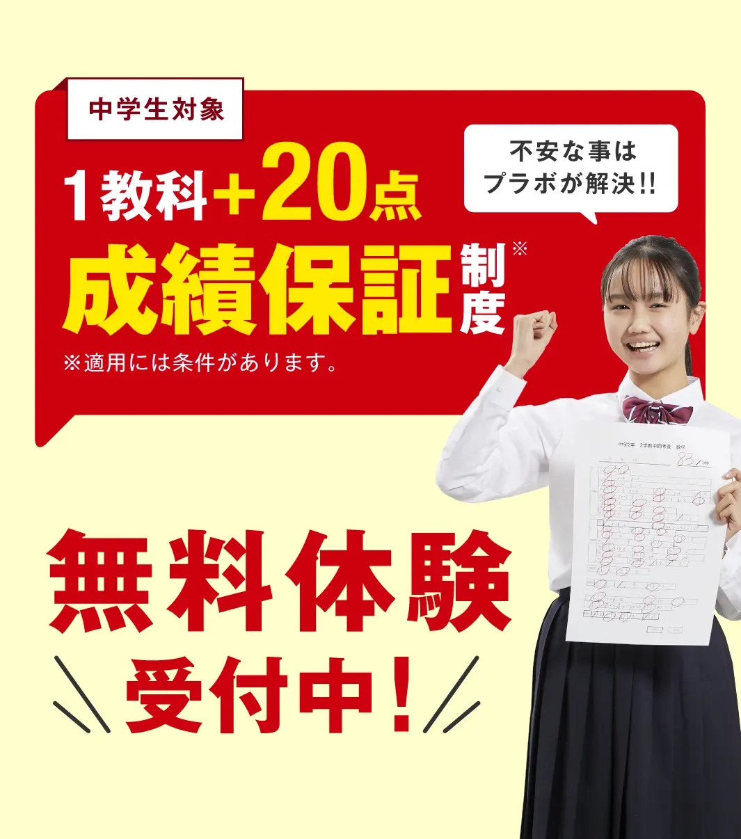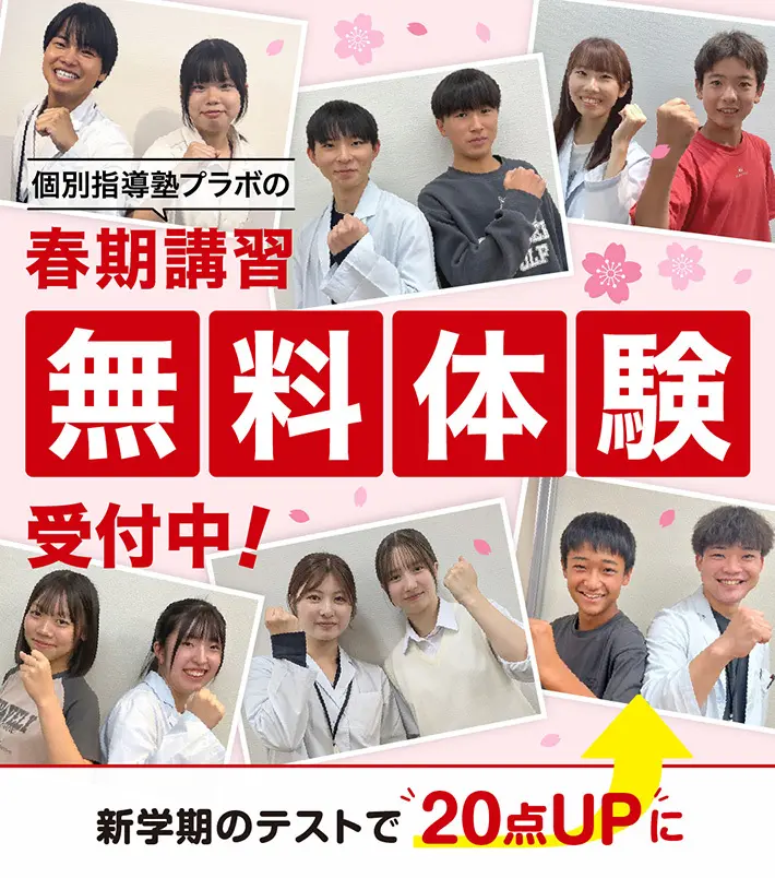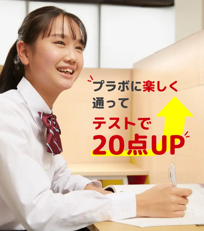 プラボは、「先生1人に生徒2人まで」の指導で、楽しく勉強して成績アップできる塾です。自信があるからできる「1教科+20点の成績保証」は、保護者様に大変ご好評いただいております。