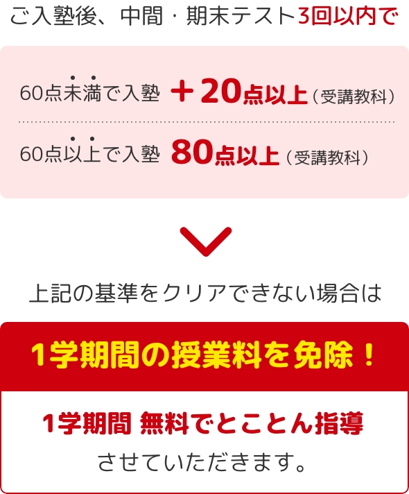 ※別途諸経費がかかります。 ※中学生が対象で中学1年の12月から中学3年生の4月までに入塾された方が対象です(英語を除く)。 ※100点満点の地域以外では、成績保証の内容・条件が異なりますのでお問合わせください。